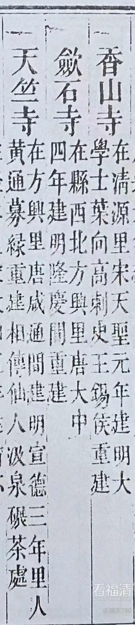 康熙十一年(1672年)的《福清县志》,共收入圣迹寺、鹫峰寺等42所寺院,有天竺寺的记载:“天竺寺,在方兴里,唐咸通间建,明宣德三年里人黄通募缘重建,相传仙人汲泉碾茶处。”乾隆十二年(1747年)的《福清县志》共收入圣迹寺、永丰寺等60所寺院,也有天竺寺,描述同上。康熙六年(1667年)即非禅师在日本编撰的《福清县志续略》,共收入护国寺、嘉福寺等71所寺观,没有天竺寺。