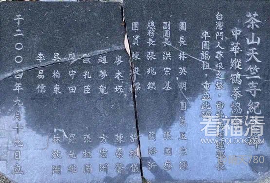 在露天观音立像身后,靠着木屋摆放着两块功德碑。其中捐资最多的人名叫“邱德茶”,捐了十五元整,名字里带有“茶”字,可能与此地产茶有直接关联。还有几位方姓捐资者方永淮、方绍翥。方永淮是“宗鹤拳”一代宗师方世培的侄子;方绍翥方世培的次孙,也是现任非遗传承人方长灿方的曾祖父。宗鹤拳是中国南拳拳种之一,发祥地就是茶山自然村方世培六扇厝故居。天竺寺离此地几百米之遥,地缘的便利,使天竺寺成为习武之地,宗鹤拳弟子现在遍布世界各地。在另一处铁皮房前,靠着一块断成三截的《茶山天竺寺纪念碑》,记载着二十年前台湾宗鹤拳门人的一次寻根之旅。
