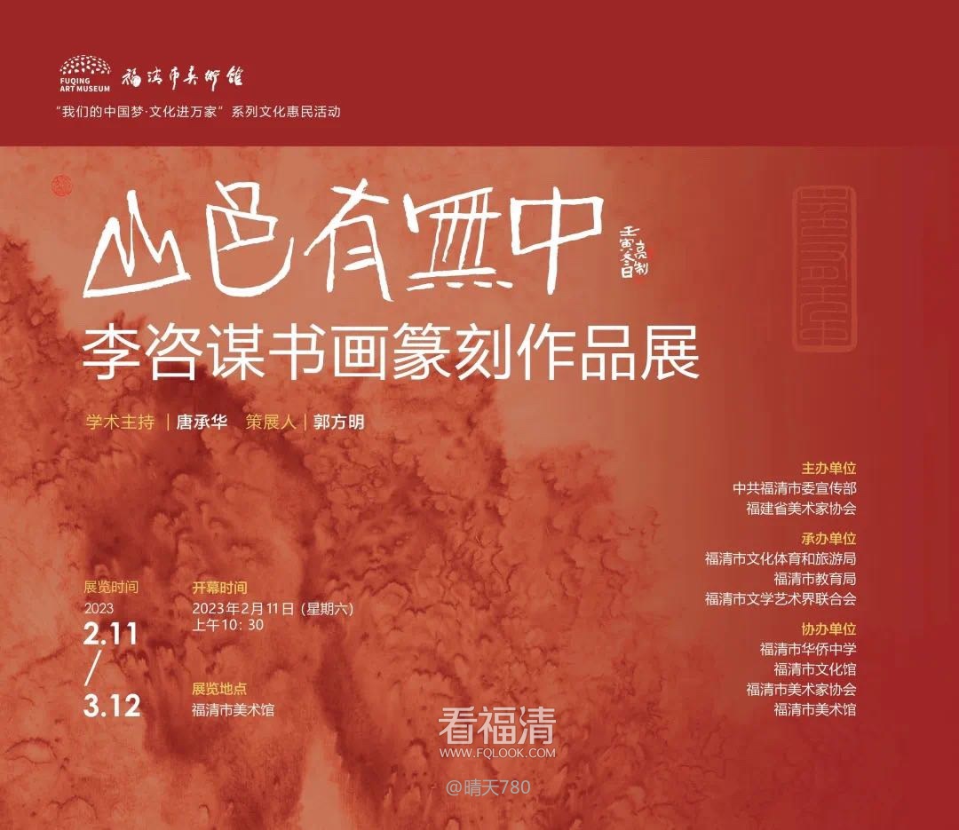 经过紧张筹备,由中共福清市委宣传部、福建省美术家协会共同主办,福清市文化体育和旅游局、福清市教育局、福清市文学艺术界联合会联合承办,福清市华侨中学、福清市文化馆、福清市美术家协会、福清市美术馆协办的“山色有无中——李咨谋书画篆刻作品展”即将与观众朋友们见面,敬请期待!