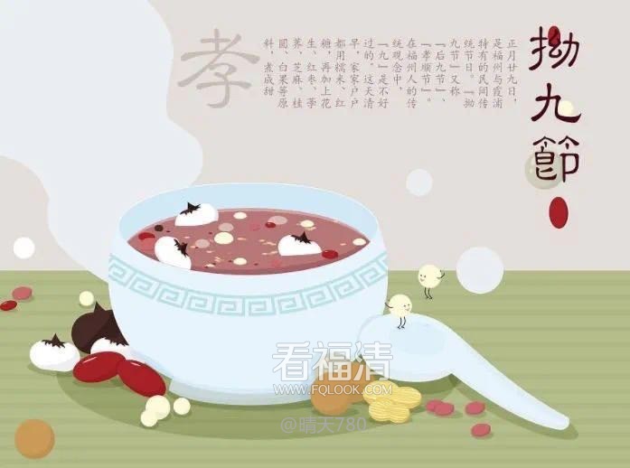 据传,古时候有一个叫目连的人,其母生前悍恶,害别人死后,被关在阴间牢房里,他探监时,经常送食物给母亲吃,但均被看守的狱卒小鬼给吃掉了。后来,他想了一个办法,用荸荠、花生、红枣、桂圆、 红糖等原料与糯米混合,煮成甜粥,盛上碗后,再洒一把黑芝麻送去给母亲,看守狱卒见这稀饭黑乎乎的,问道:“ 这是什么?” 目连随口答道∶“这是拗垢”。(福州话“九”与“垢”谐音)看守信以为真,认为这粥很脏,不敢吃。因此“拗九粥”才得以送到目连母亲的手中。这天正好是正月廿九,目连的母亲这年也正好二十九岁,闽俗中,正月分“三九”,正月初九称为“上九”,十九称为“中九”,廿九称为 “后九”,所以这粥便叫“后九粥”。以后又以粥的颜色拗黑,叫“拗九粥”,又以目连孝顺母亲,又叫“孝九粥” 。 乡人赞叹目连的孝心,遂仿其孝行。于每年正月廿九煮“拗九粥”孝敬双亲及邻里长辈,并相沿成俗,演绎出“拗九节”这个民俗,流传至今。