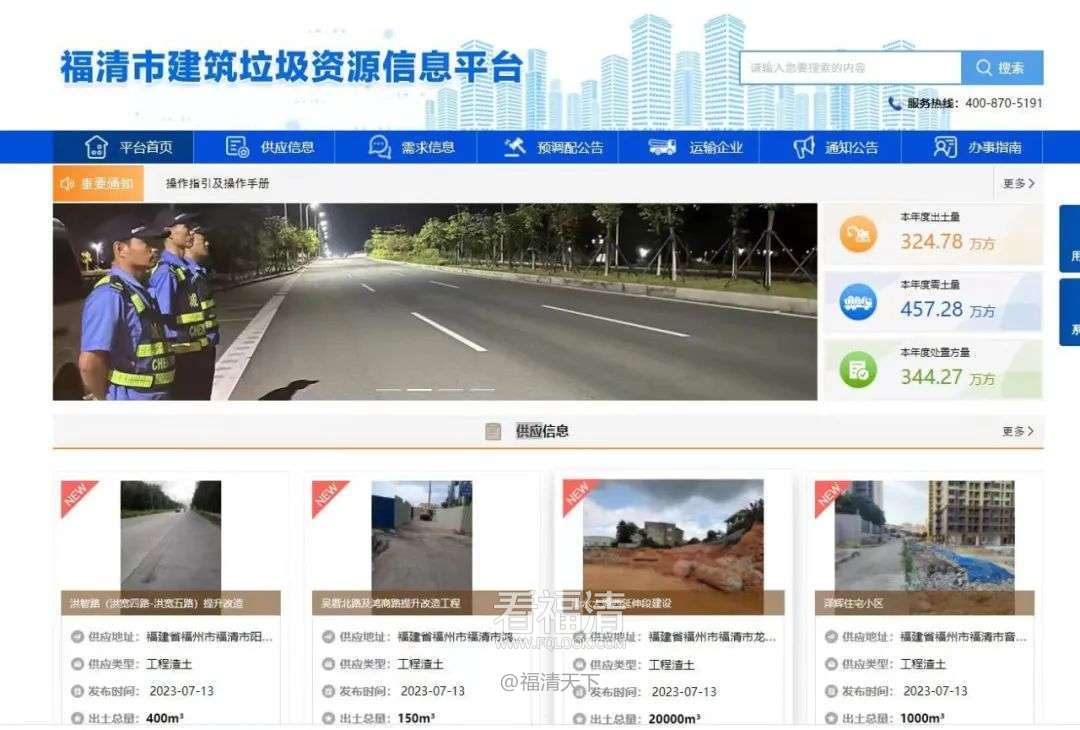 三、全面保障,当好建筑垃圾管理“看护员”抓企业规范化。对建筑垃圾运输企业、运输车辆和驾驶员实行登记准入制度,严格把控备案环节,每年对符合要求的运输企业、运输车辆、驾驶员进行核实备案。所有备案车辆均纳入“智慧城管综合服务中心”监管。今年以来,共备案32家运输企业,384部运输车辆。推资源透明化。2022年9月,福清市建筑垃圾资源信息平台正式上线运行,可实时将全市建筑垃圾供需情况在网上发布,方便供需双方直接对接协商,有效解决了供需双方及运输企业间信息不畅的问题,使建筑垃圾资源真正市场化,实现建筑垃圾资源调剂透明化监管。自上线以来,共发布219条供应信息,261条需求信息,调配方案338份。