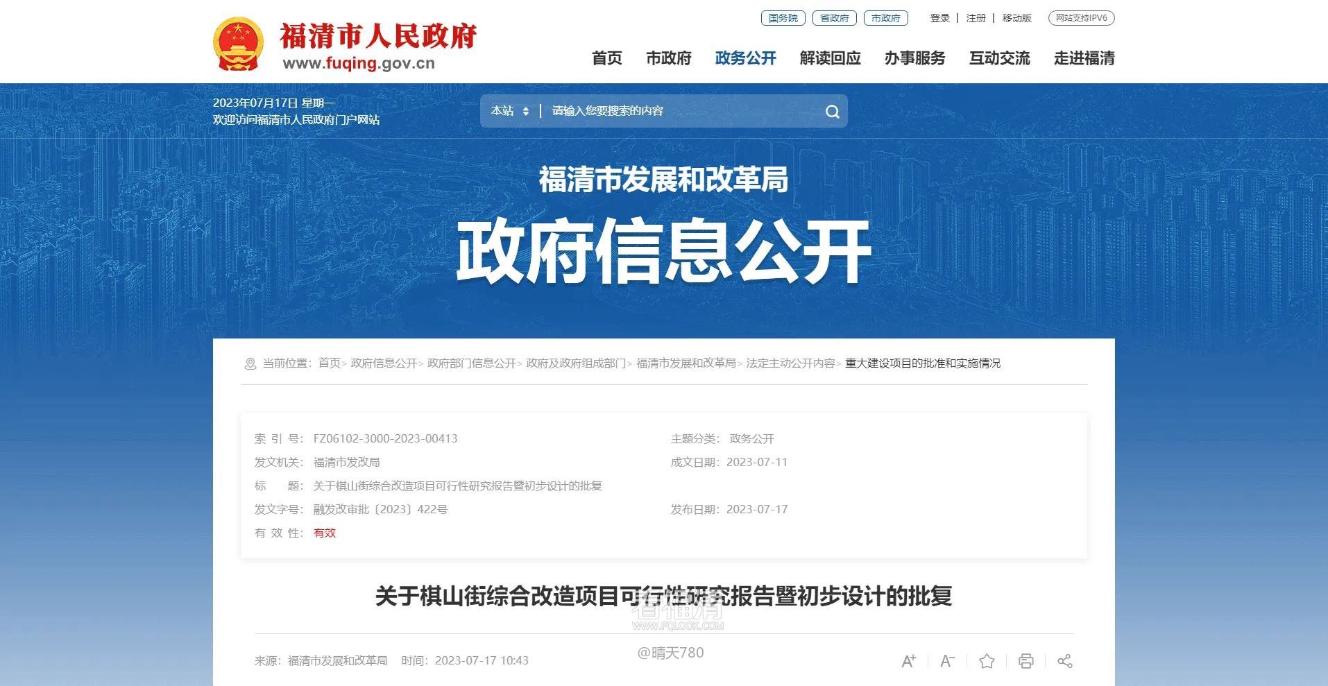 近日,福清市发展和改革局公示了《关于清宏路立面改造项目可行性研究报告暨初步设计的批复》、《关于棋山街综合改造项目可行性研究报告暨初步设计的批复》。