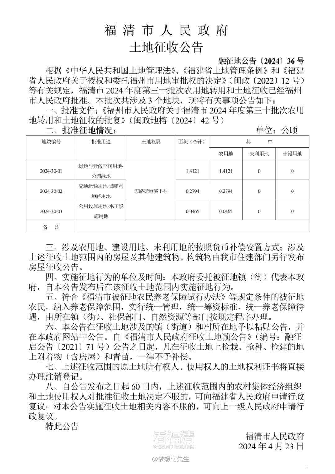 同意将福清市境内农用地1.7380公顷(其中耕地0.6918公顷)转为建设用地。征收福清市宏路街道溪下村旱地0.6918公顷、园地0.3964公顷、林地0.4054公顷、其他农用地0.2444公顷。合计征收集体所有土地1.7380公顷,按规划用途使用。