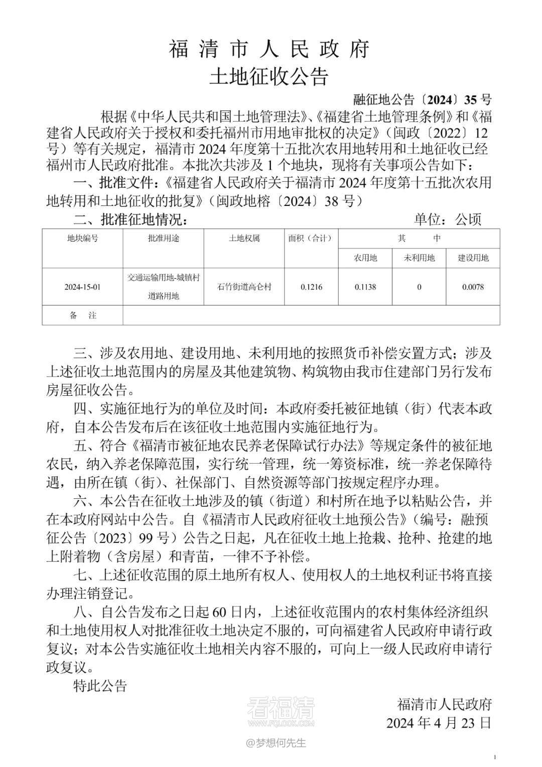 同意将福清市境内农用地0.1138公顷(其中耕地0.0253公顷)转为建设用地。征收福清市石竹街道高仑村旱地0.0253公顷、园地0.0622公顷、其他农用地0.0263公顷、城镇村及工矿用地0.0078公顷。合计征收集体所有土地0.1216公顷,按规划用途使用。
