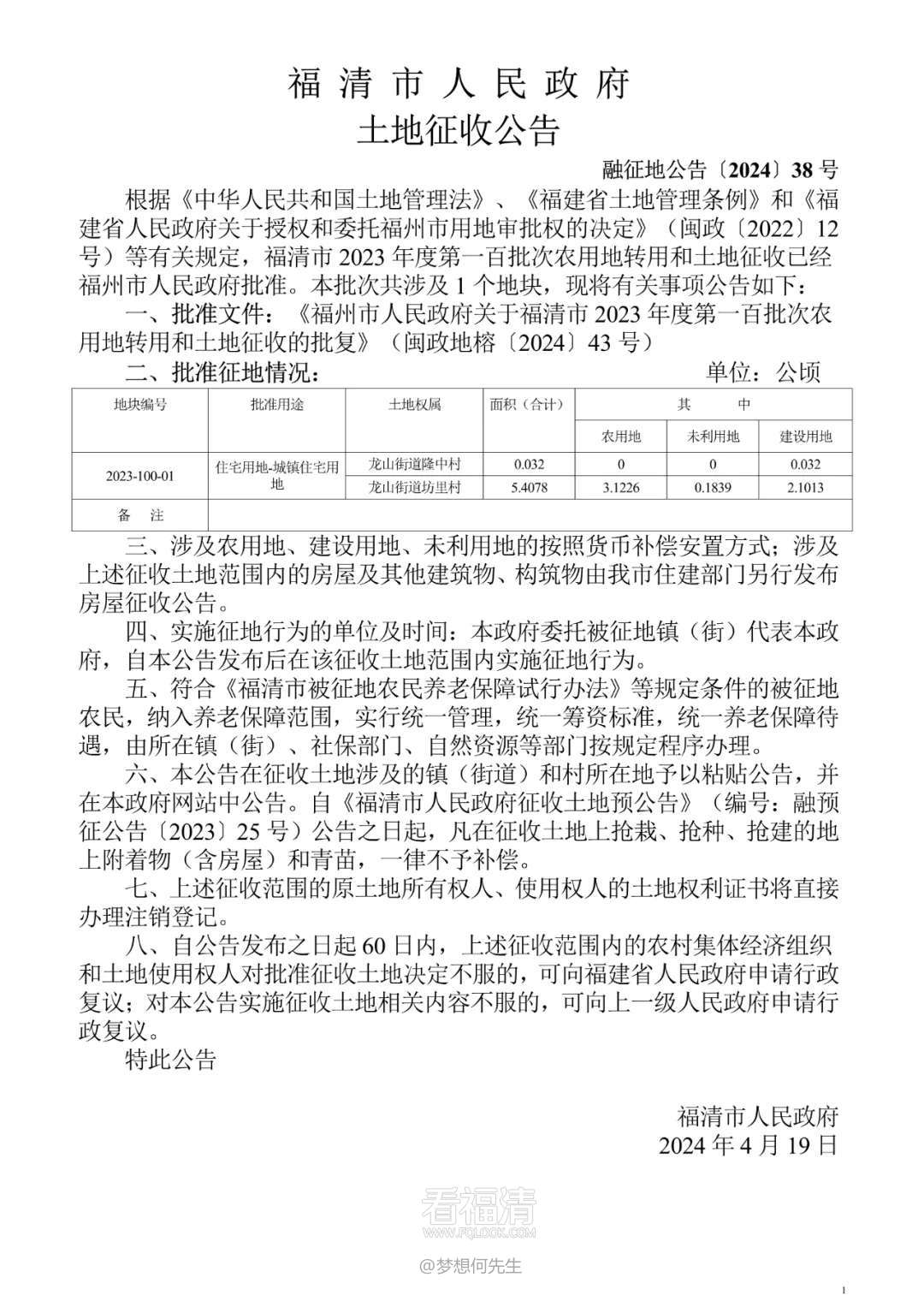 同意将福清市境内农用地3.1226公顷(其中耕地2.8873公顷)、未利用地0.1839公顷转为建设用地。征收福清市龙山街道坊里村水田2.8873公顷、其他农用地0.2353公顷、城镇村及工矿用地2.1013公顷、水域0.1839公顷,龙山街道隆中村城镇村及工矿用地0.0320公顷。合计征收集体所有土地5.4398公顷,按规划用途使用。