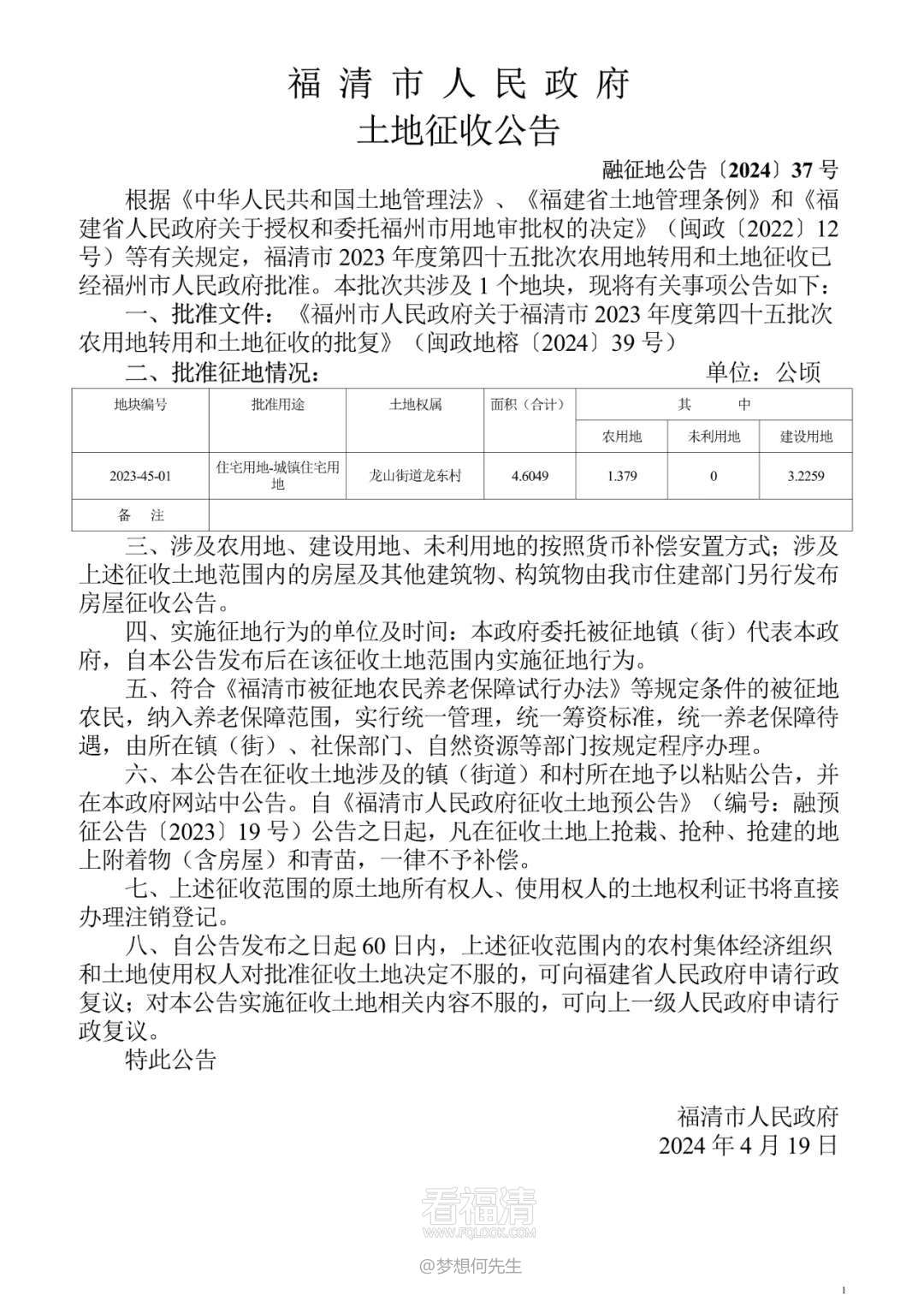 同意将福清市境内农用地1.3790公顷(其中耕地0.9532公顷)转为建设用地。征收福清市龙山街道龙东村水田0.0960公顷、旱地0.8572公顷、园地0.1851公顷、其他农用地0.2407公顷、城镇村及工矿用地3.2259公顷。合计征收集体所有土地4.6049公顷,按规划用途使用。
