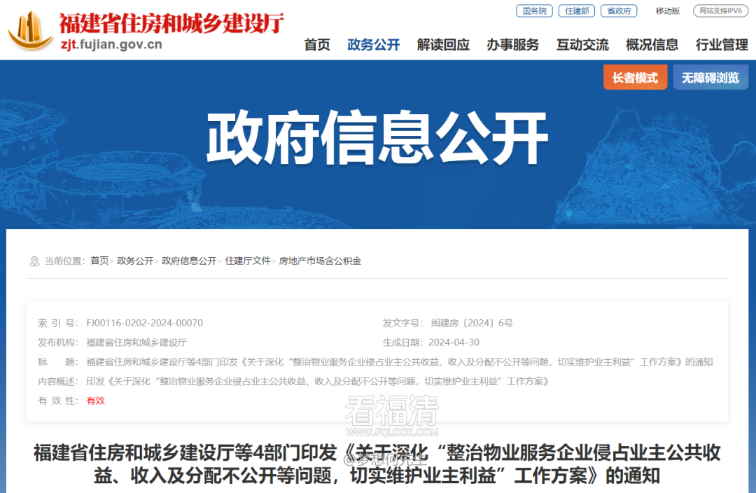 为深化推进物业服务企业侵占业主公共收益“点题整治”专项行动,维护好住宅小区业主合法权益,福建省住建厅等4部门印发《关于深化“整治物业服务企业侵占业主公共收益、收入及分配不公开等问题,切实维护业主利益”工作方案》的通知。