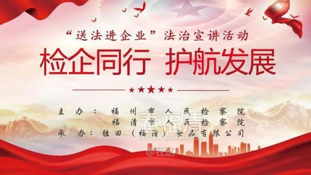 福州市检察院法律政策研究室主任尹琳,福清市检察院党组成员、副检察长郑承武,福清市工商联党组成员、专职副主席林秉芳,福清市台湾渔民事务工作站站长陈春,20余家民营企业代表及2家台企代表等60余人在胜田(福清)食品有限公司参加了讲座。
