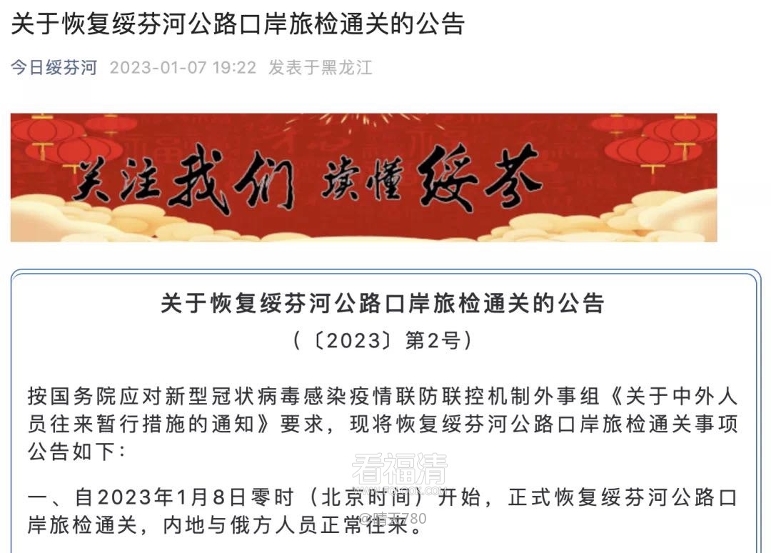 黑龙江省绥芬河市:1月8日零时开始,正式恢复绥芬河公路口岸旅检通关,内地与俄方人员正常往来。