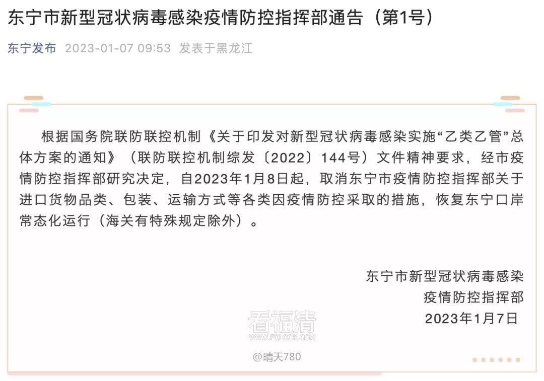 黑龙江省东宁市:1月8日起,取消东宁市疫情防控指挥部关于进口货物品类、包装、运输方式等各类因疫情防控采取的措施,恢复东宁口岸常态化运行(海关有特殊规定除外)。