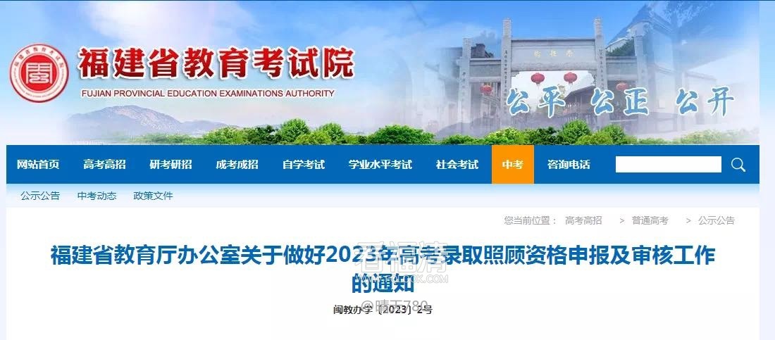 福建省教育厅近日发布《关于做好2023年高考录取照顾资格申报及审核工作的通知》,符合条件的考生须于2023年2月9日前,向本人高考报名现场确认点所在区招办提出申请,确有特殊原因的普通高考考生,可在高考补报名时一并申请。