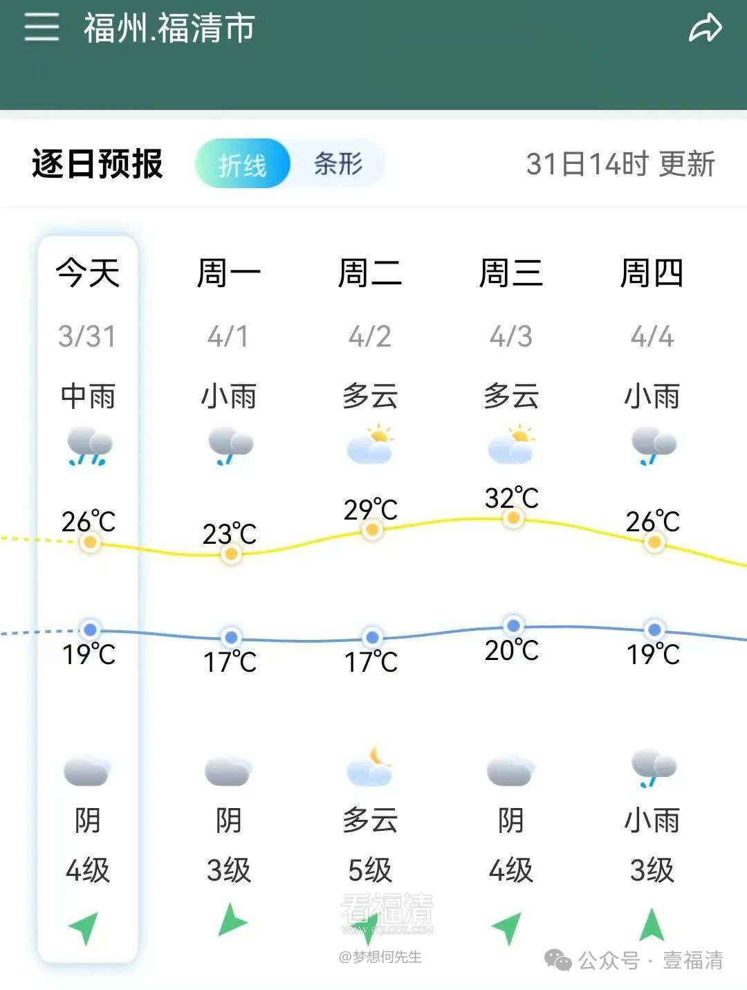 4月1日白天到夜间阴有阵雨或雷阵雨,局部有中雨,白天最高气温21℃,4月2日早晨最低气温17℃,内陆偏北风2~3级,沿海偏北风4~5级阵风6~7级。