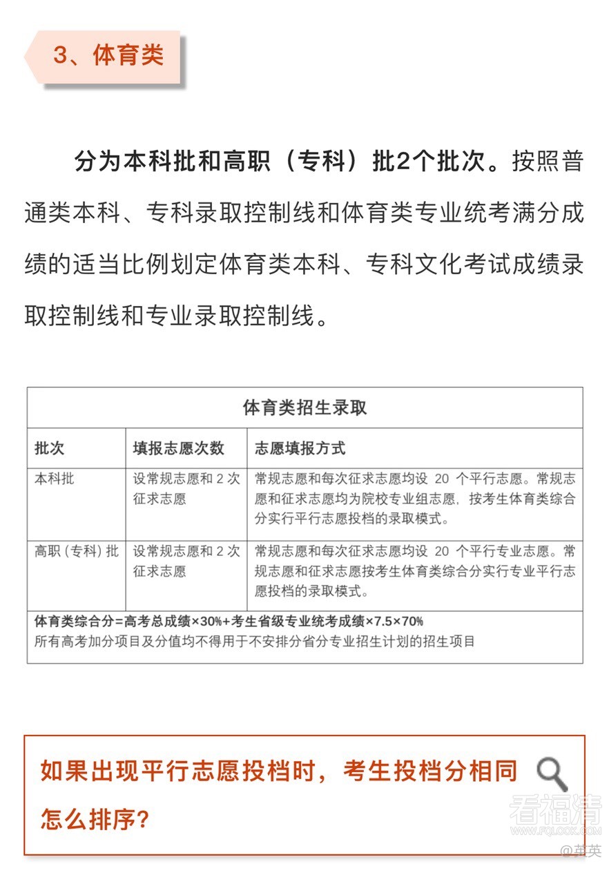 艺术类和体育类考生根据综合分排序。成绩分数相同的,先按享受同等条件优先录取的条件排序,再依次按高考总成绩、语文数学两科成绩之和、语文或数学单科最高成绩、外语成绩、首选科目(物理或历史)成绩、再选科目单科最高成绩、再选科目单科次高成绩顺序排序。如果位次仍相同,再比较考生志愿顺序,顺序在前者优先投档,志愿顺序相同则全部投档,是否录取由招生院校决定。