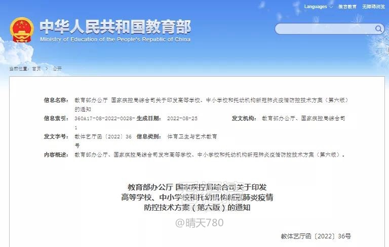 8月26日,教育部官网发布了教育部、国家疾控局组织制定的《高等学校新冠肺炎疫情防控技术方案(第六版)》《中小学校新冠肺炎疫情防控技术方案(第六版)》和《托幼机构新冠肺炎疫情防控技术方案(第六版)》。其中,新一版的高校新冠肺炎疫情防控方案明确,不得对来自低风险区的师生员工采取集中隔离等“层层加码”措施。