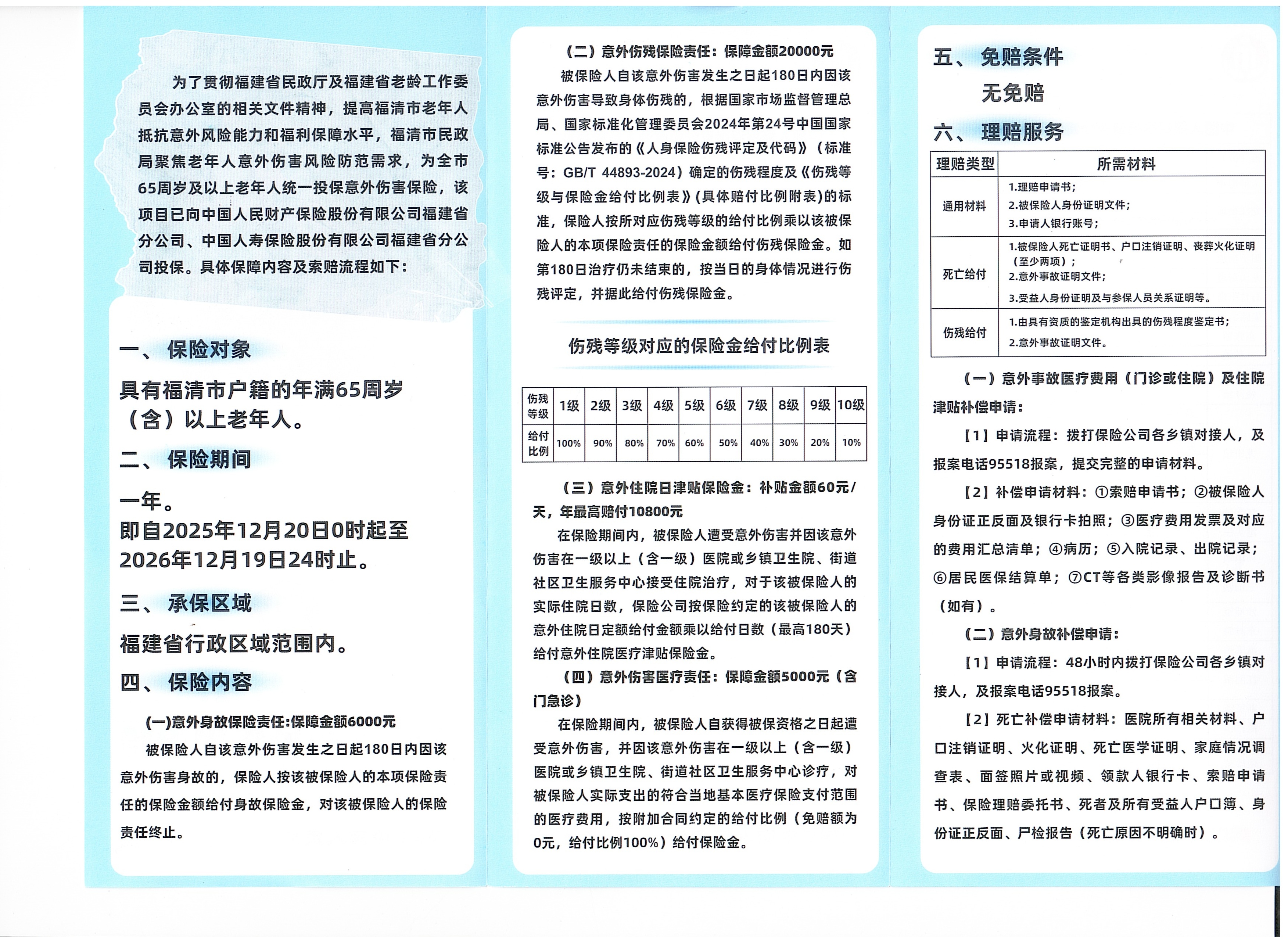 为了贯彻福建省民政厅及福建省老龄工作委员会办公室的相关文件精神,提高福清市老年人抵抗意外风险能力和福利保障水平,福清市民政局聚焦老年人意外伤害风险防范需求,为全市65周岁及以上老年人统一投保意外伤害保险,该项目已向中国人民财产保险股份有限公司福建省分公司、中国人寿保险股份有限公司福建省分公司投保。 为方便参保群体了解相关权益、办理理赔事宜,现将保险具体内容及理赔流程等相关事宜公告如下: 一、保险对象 具有福清市户籍的年满65周岁(含)以上老年人。 二、保险期间 一年。即自2025年12月20日0时起至2026年12月19日24时止。 三、承保区域 福建省行政区域范围内。 四、保险内容 (一)意外身故保险责任:保障金额6000元 被保险人自该意外伤害发生之日起180日内因该意外伤害身故的,保险人按该被保险人的本项保险责任的保险金额给付身故保险金,对该被保险人的保险责任终止。 (二)意外伤残保险责任:保障金额20000元 被保险人自该意外伤害发生之日起180日内因该意外伤害导致身体伤残的,根据国家市场监督管理总局、国家标准化管理委员会2024年第24号中国国家标准公告发布的《人身保险伤残评定及代码》(标准号:GB/T 44893-2024)确定的伤残程度及《伤残等级与保险金给付比例表》(具体赔付比例附表)的标准,保险人按所对应伤残等级的给付比例乘以该被保险人的本项保险责任的保险金额给付伤残保险金。如第180日治疗仍未结束的,按当日的身体情况进行伤残评定,并据此给付伤残保险金。 伤残等级对应的保险金给付比例表