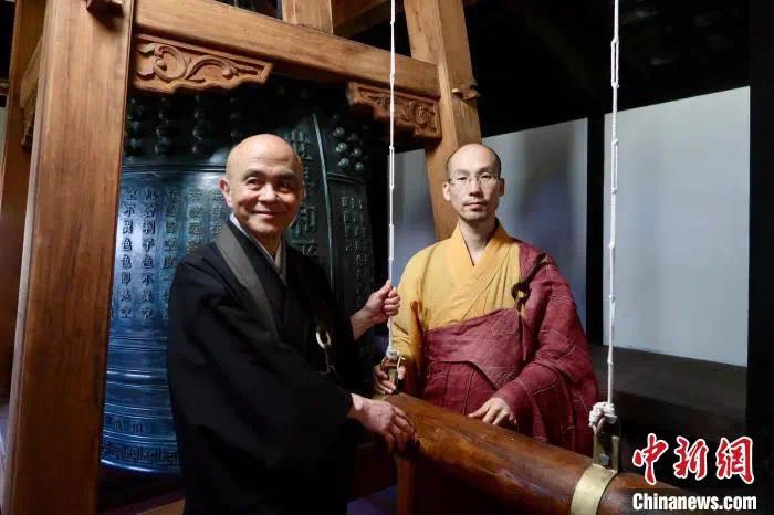 定明法师(右)与松尾长老(左)一起敲响和平钟。