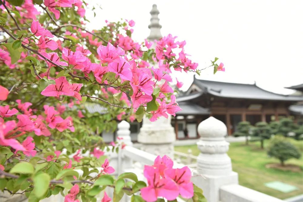 作为中国佛教禅宗临济宗的祖庭之一,福建黄檗山万福寺经过多次兴废、重建、改建,如今黄檗寺的寺院建筑群组与平面布局,整体呈唐时建筑风格。规模宏大、布局合理、环境优美、佛像庄严、殿堂巍峨,凸显祖庭之恢弘庄严。寺占地一百余亩,各殿堂之间由回廊相连,全堂采用纯木结构,其木料均为印尼菠萝格,整体呈现出一种廊腰缦回、檐牙高啄之美。寺门右侧为放生池,石板路上,姹紫嫣红的夹道三角梅,怒放着它的花叶,一直延伸到外山门,放眼望去,有湖,有山。