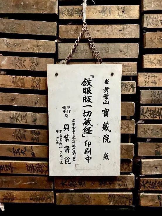 在贮藏《大般若经》版片的柜架上,挂着一块指示牌,上面写着:黄檗山宝藏院,《铁眼版一切经》印刷中,印行颁布所“贝叶书院”。后面是地址“京都市中京区二条通木屋町西入”,电话是(075)231—0919。