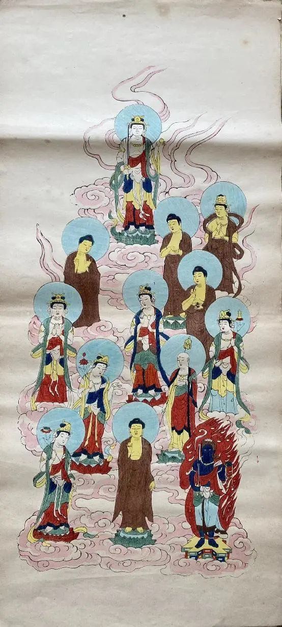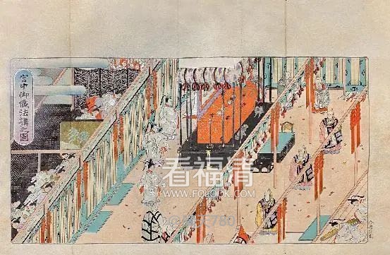 在贝叶书院店售柜台上,有许多老版画在售,几乎未加挑选,就买下了其中的三种。有一种是《宫中御忏法讲之图》设色版画,是三千院门迹所藏,贝叶书院明治29年(1895)所出《皇朝天台史略》一书的卷首插图。三千院是天台宗的寺院,创建于1118年。三千院作为天台宗五门跡和京都五室门跡之一,在京都众多寺院的重要地位可见一斑。寺院内古树参天,青苔遍地,溪水潺潺。4月樱花、5月杜鹃、7月紫阳花,进入红叶季后,其色彩之饱满浓郁令人叹为观止,是“京都红叶狩”必去经典场所之一。另一幅彩色《十三佛缩蜜图》,店主说起码有一百多年了。还有一种是《释迦三尊佛》,也是老版刷印。