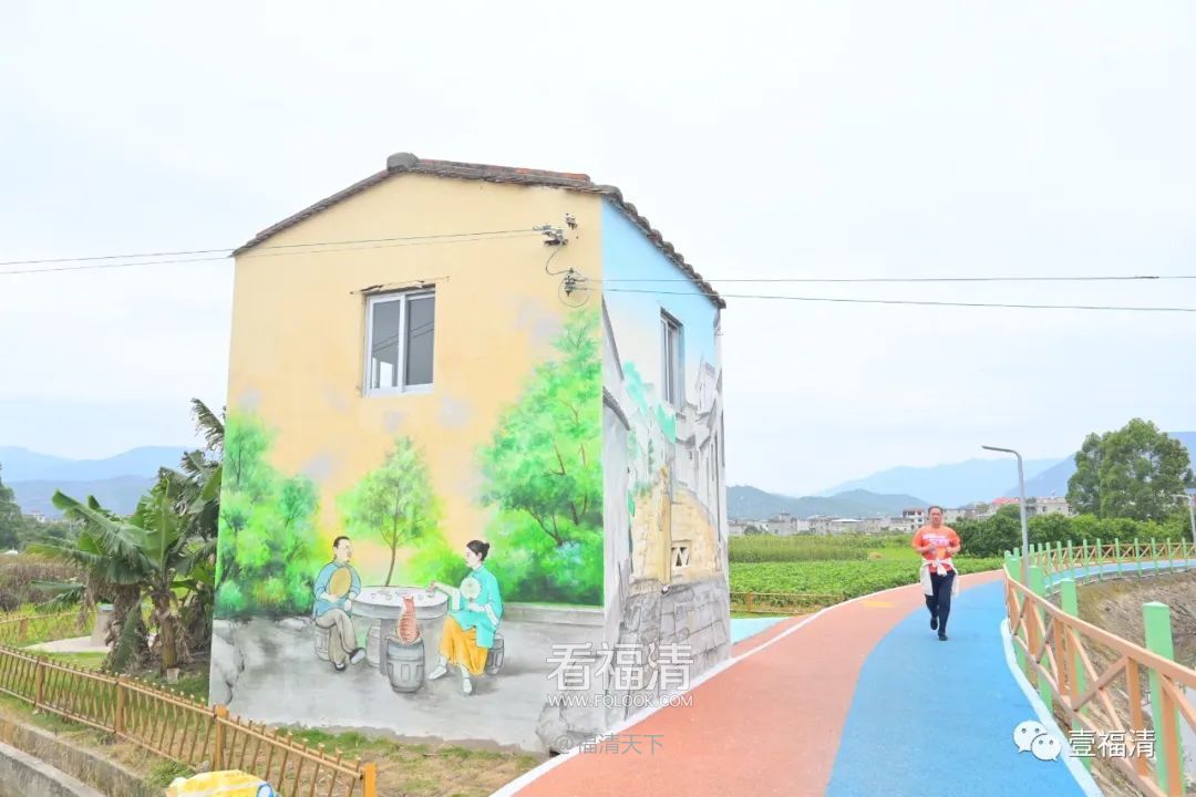 步道所穿过的房屋,那些民房、动物圈、杂物间、洗手间,外墙都画上了一幅幅立体的彩色田园生活图。“院子休闲喝茶图”“路边节日包粽图”“山坡摘菜合欢图”“田间耕地农作图” ……无不展示着田园生活的和谐、快乐和温馨。