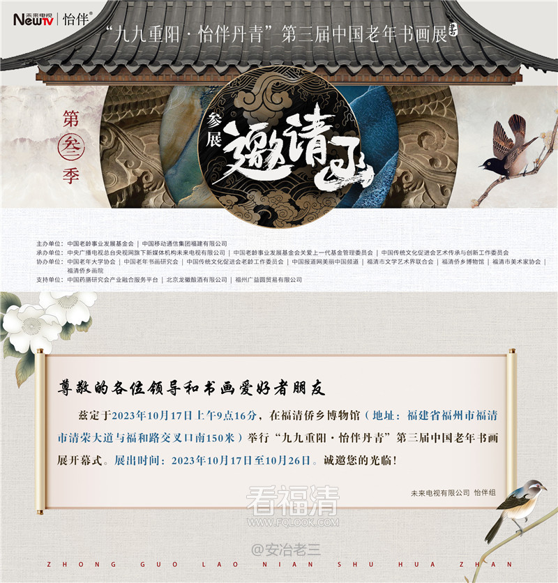 10月17日,由中国老龄事业发展基金会与中国移动通信集团福建有限公司联合主办的“九九重阳·怡伴丹青”第三届中老年书画展在福建省福州市福清侨乡博物馆隆重开幕。未来电视受邀参与,携怡伴康养服务产品亮相活动,以科技助力养老服务,让现场参观的朋友既享受到了传统文化的熏陶,也体验到了数字文化的魅力,以实际行动推动“文化养老”落地。