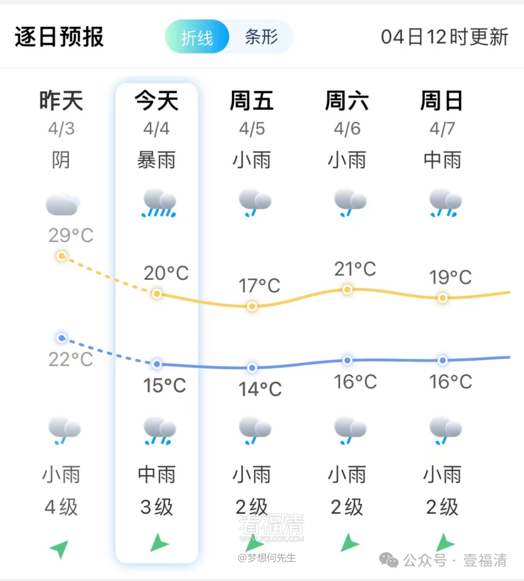 07日早晨最低气温16℃,内陆东北风2~3级,沿海东北风4~5级阵风6级。福清市气象台2024年04月04日10时发布。