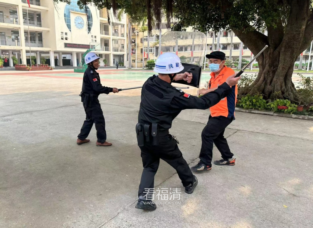 保安人员一分钟内携带安保器械迅速抵达现场,他们使用防护警棍、手持钢叉、盾牌与暴恐分子进行周旋,为师生撤离争取了时间,也为警方的到来争取时间,同时寻找机会制服。