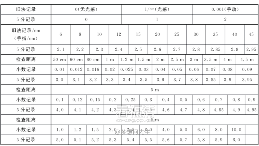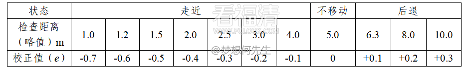 b)被检者向远视力表走近至表1左侧所列某一检查距离时,测得的5分记录值加相应校正值e后即为其实际视力;