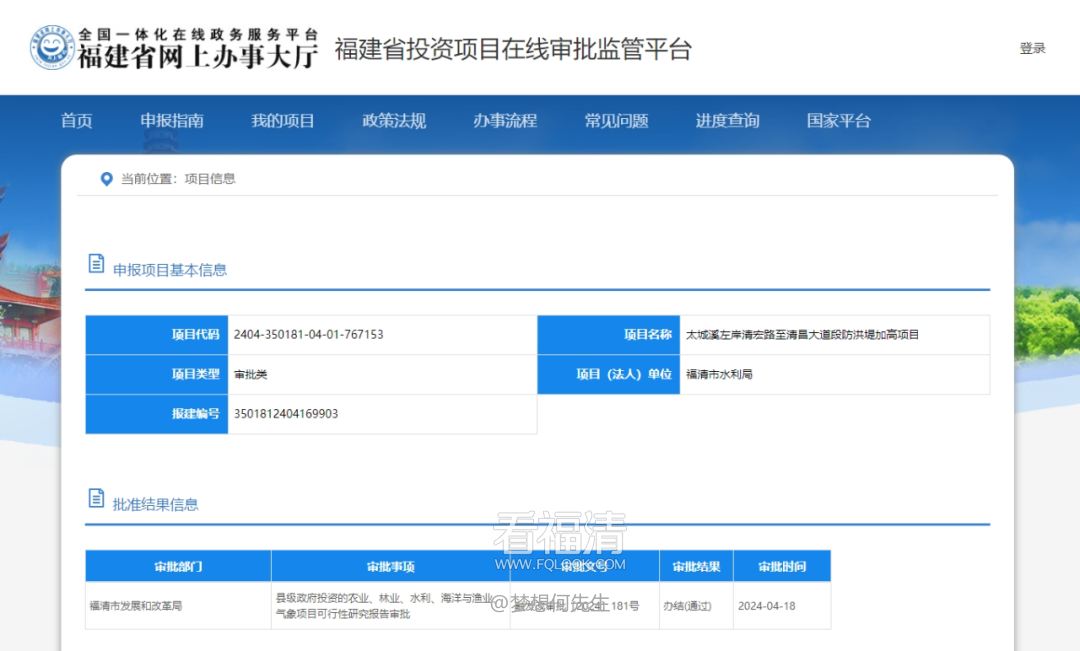 福建省投资项目在线审批监管平台公示,“太城溪左岸清宏路至清昌大道段防洪堤加高项目”已通过县级政府投资的农业、林业、水利、海洋与渔业、气象项目可行性研究报告审批,项目(法人)单位为福清市水利局,备案号为融发改审批〔2024〕181号。