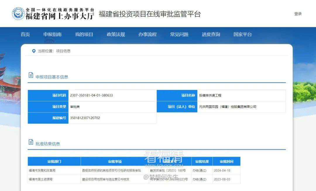 福建省投资项目在线审批监管平台公示,“后俸排洪渠工程”已通过县级政府投资的其他项目可行性研究报告审批,项目(法人)单位为元洪两国双园(福建)控股集团有限公司,备案号为融发改审批〔2023〕180号。