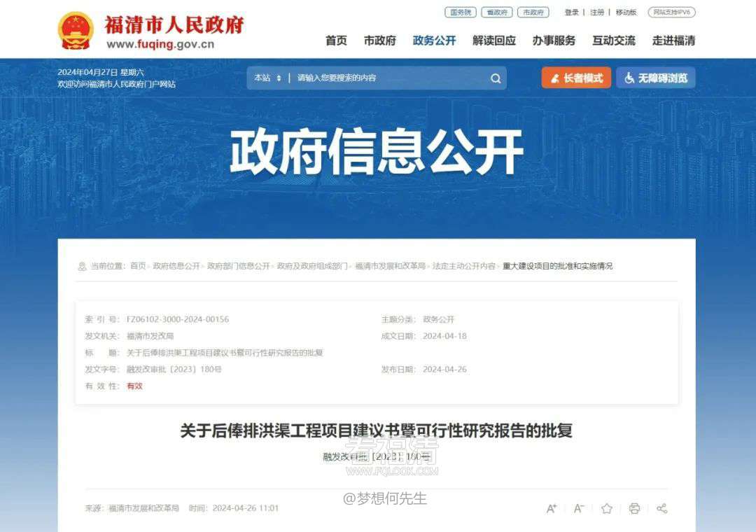 2024年4月26日,福清市发展和改革局发布了关于后俸排洪渠工程项目建议书暨可行性研究报告的批复,为解决元洪投资区防洪排涝问题,原则同意项目建设。