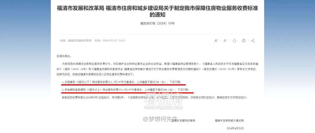 根据福清市发展和改革局、福清市住房和城乡建设局发布的“关于制定我市保障住房物业服务收费标准的通知”: