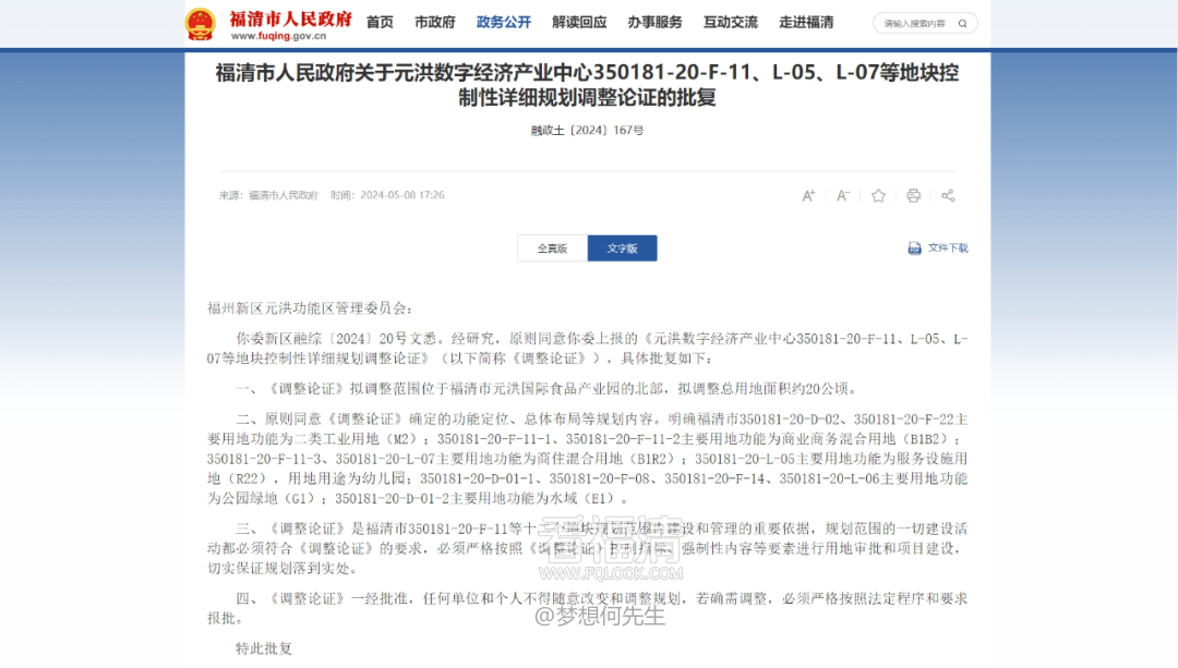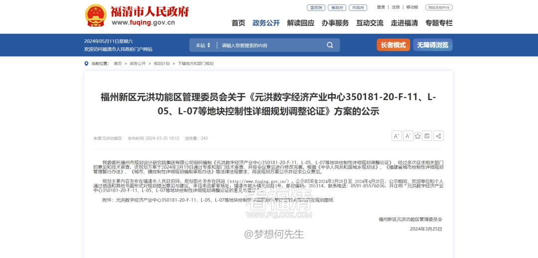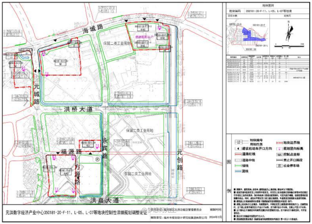 3月25日, 福州新区元洪功能区管理委员会通过福清市人民政府官网公示关于《元洪数字经济产业中心350181-20-F-11、L-05、L-07等地块控制性详细规划调整论证》方案。
