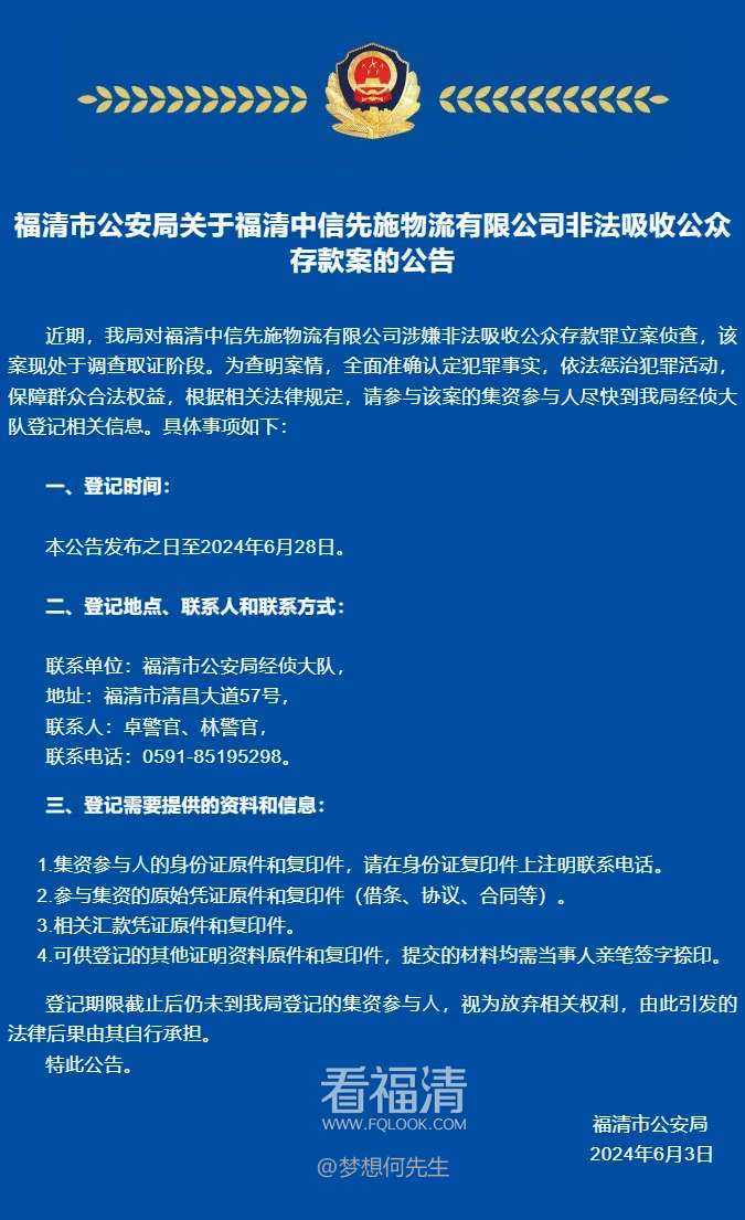 6月3日,福清市公安局发布了“关于福清中信先施物流有限公司非法吸收公众存款案的公告”(下文简称“福清中信先施”),其中提到福清市公安局对福清中信先施物流有限公司涉嫌非法吸收公众存款罪立案侦查,该案现处于调查取证阶段。为查明案情,全面准确认定犯罪事实,依法惩治犯罪活动,保障群众合法权益,根据相关法律规定,请参与该案的集资参与人尽快到市局经侦大队登记相关信息。