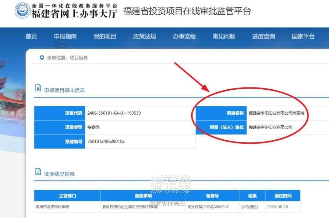 项目代码为2406-350181-04-01-193539,报建编号为3501812406280102,项目(法人)单位为福建省宇阳实业有限公司,主管部门为福清市发展和改革局。