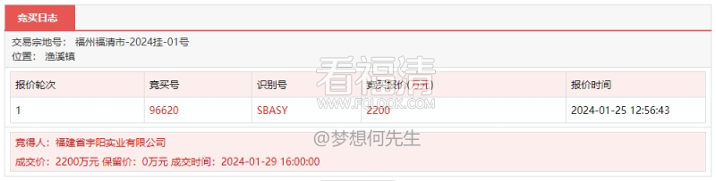 经查询获悉,“绮丽楼”对应的福建省宇阳实业有限公司以底价2200万元成功摘得位于渔溪镇的2024挂-01号地块。