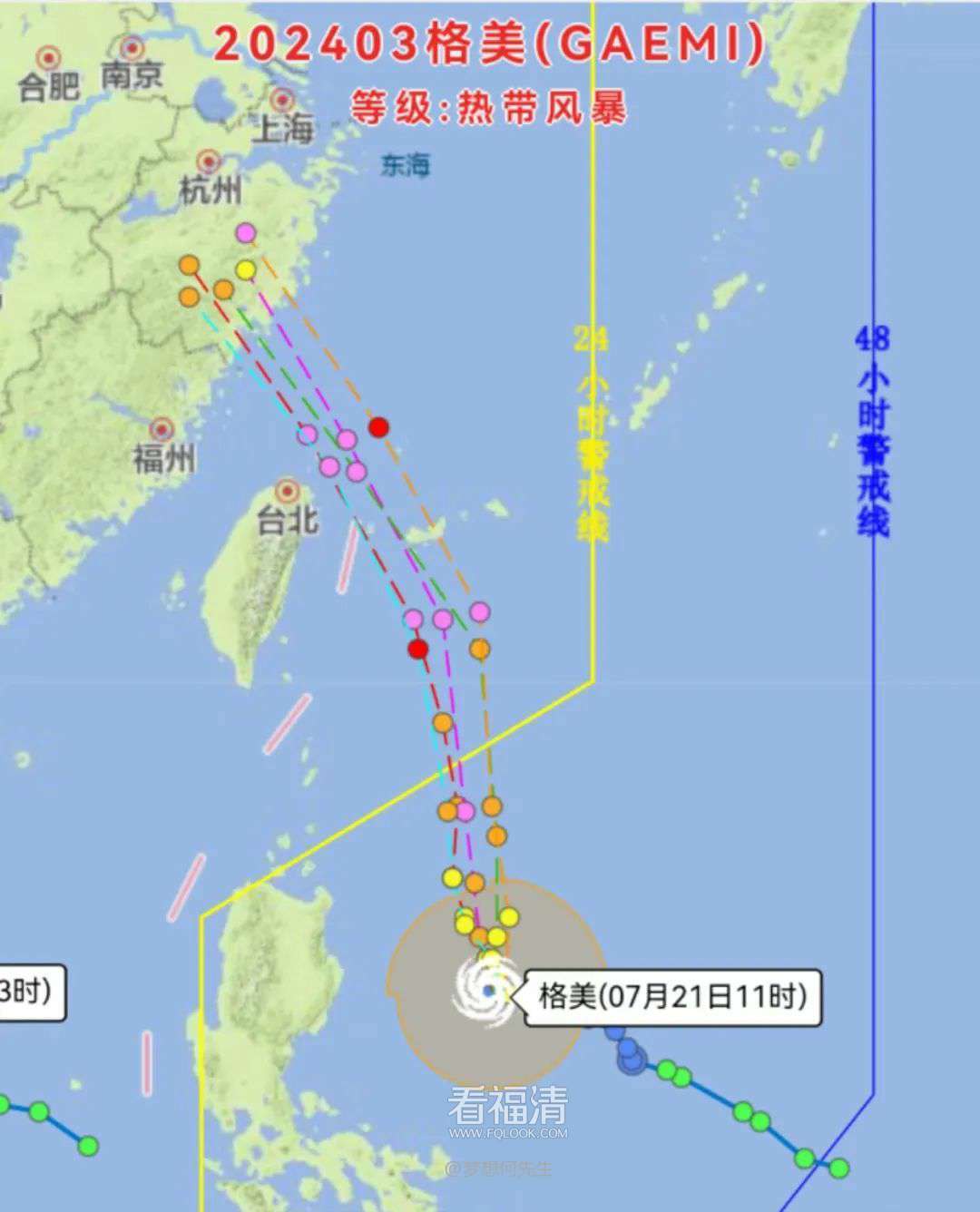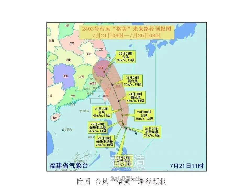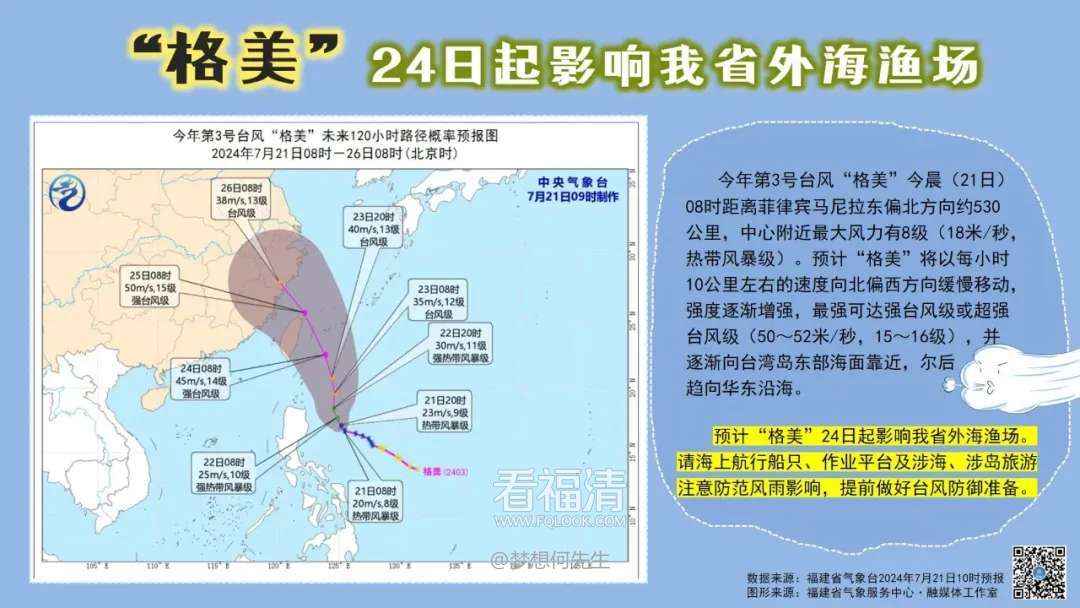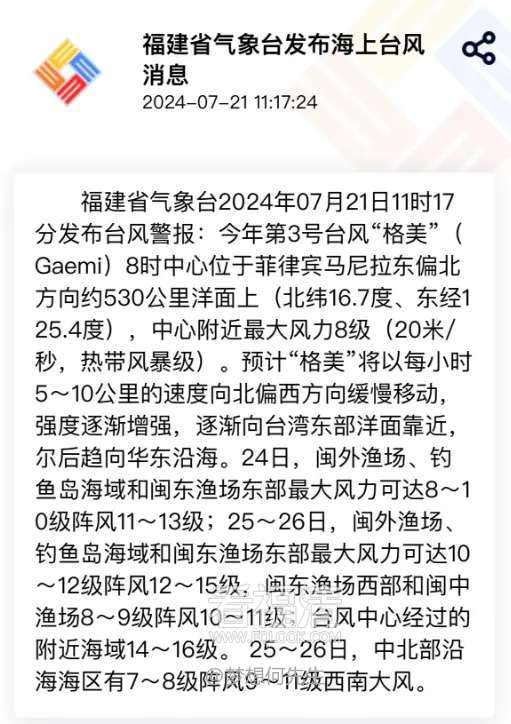 福建省人民政府防汛抗旱指挥部发出通知,今年第3号台风“格美”7月21日11时中心位于菲律宾马尼拉东偏北方向约510公里洋面上(北纬16.7度、东经125.2度),中心附近最大风力9级(23米/秒,热带风暴级)。预计“格美”将以每小时5—10公里的速度向北偏西方向缓慢移动,强度逐渐增强,逐渐向台湾东部洋面靠近,尔后趋向华东沿海。