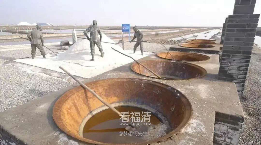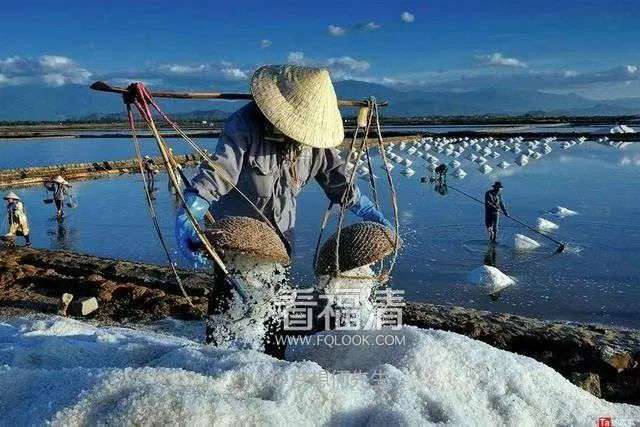 福清海岸线绵延曲折,滩涂辽阔,海水盐分浓度较高,加上风多雨少,日照充足,蒸发旺盛,适合暴晒海水,提取结晶海盐。福清先民垒堤围海,精心制作一片片、一块块镜面般的方田,让海水暴晒结晶成盐。错落有致的盐田闪光亮波,倒映出蓝天白云,恍若“天空之镜”。盐工在“镜面”之上作业,媒体人点赞“盐晒白了,人晒黑了。”