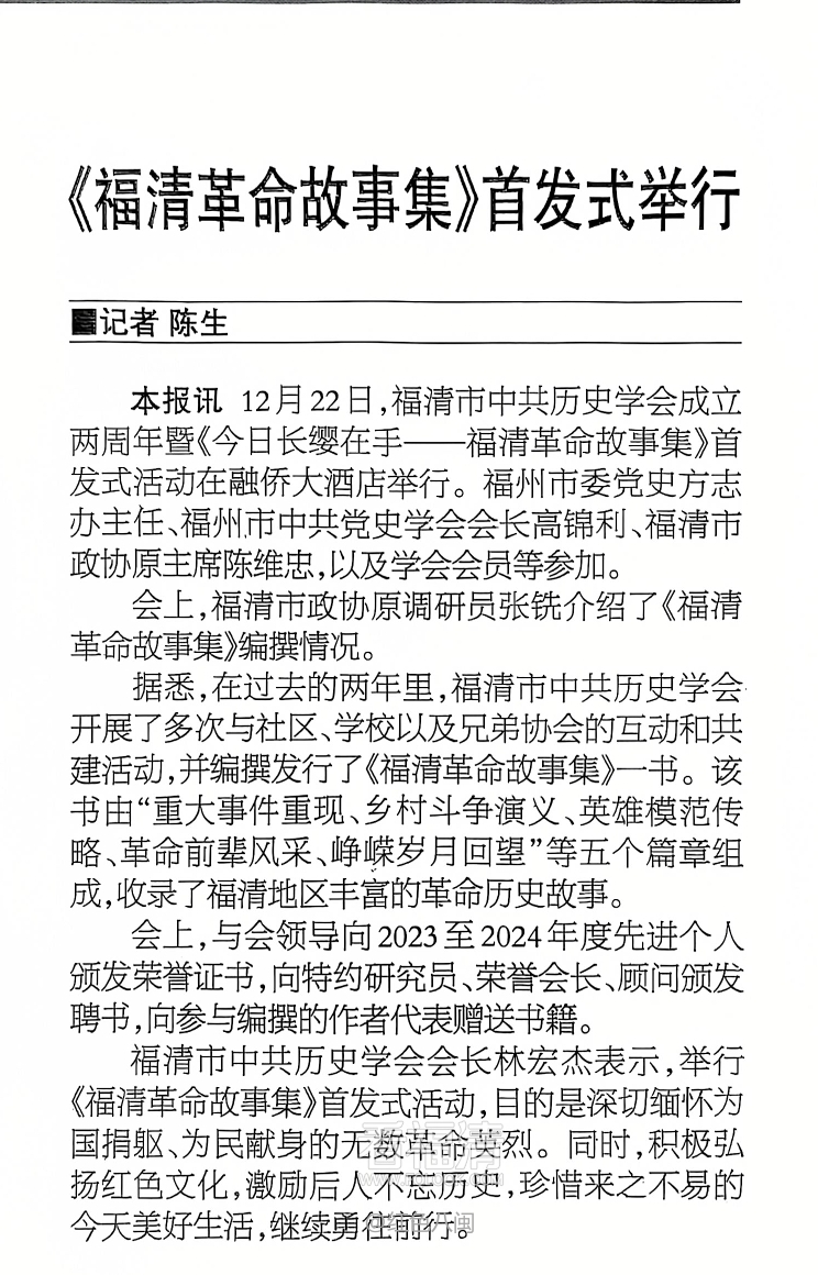 在福清市这片承载着厚重革命记忆的红色热土之上,历史的回声犹在耳畔激荡。为庆祝福清市中共历史学会成立两周年,以及福清革命故事集《今日长缨在手》的发行庆典,一场意义非凡、别具一格的庆典活动于12月22日上午9点,在福清融侨大酒店盛大举行。这不仅是一场庆祝的盛会,更是对往昔峥嵘岁月的深情缅怀与致敬。