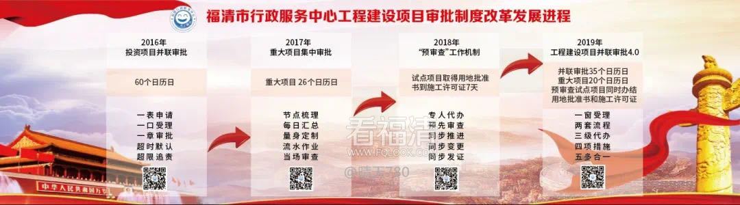 2016年,福清市行政服务中心先试先行,在福州地区率先推行“一表申请、一口受理、一章审批、超时默认、超限追责”的投资项目并联审批制度改革,将投资项目审批时限从109个工作日压缩至60个日历日,重大项目集中审批时限压缩至26个日历日。