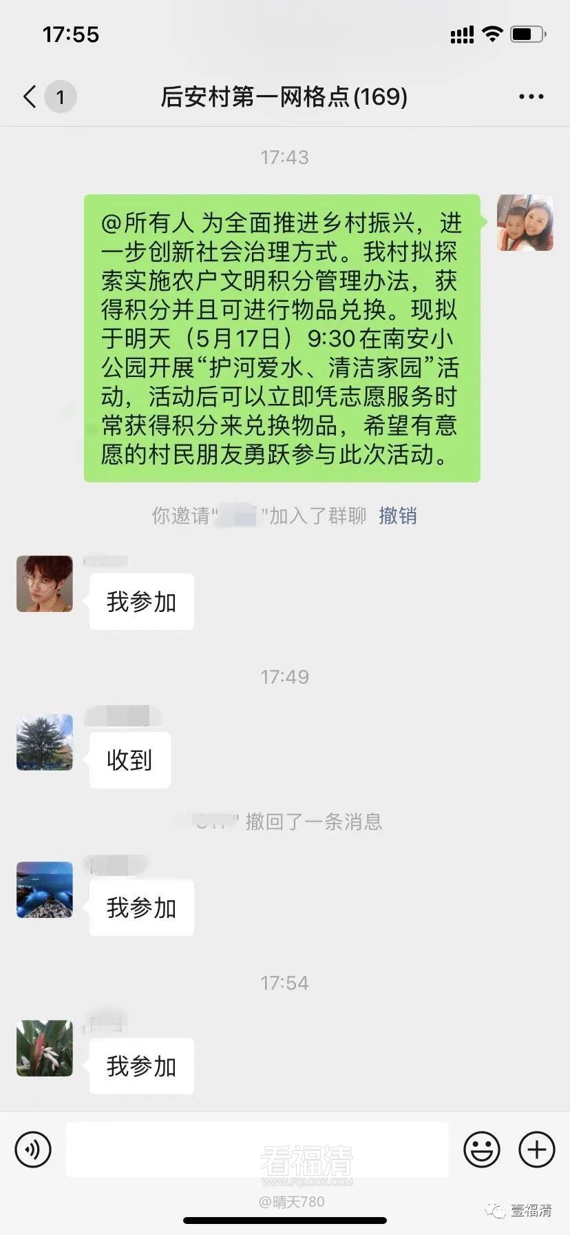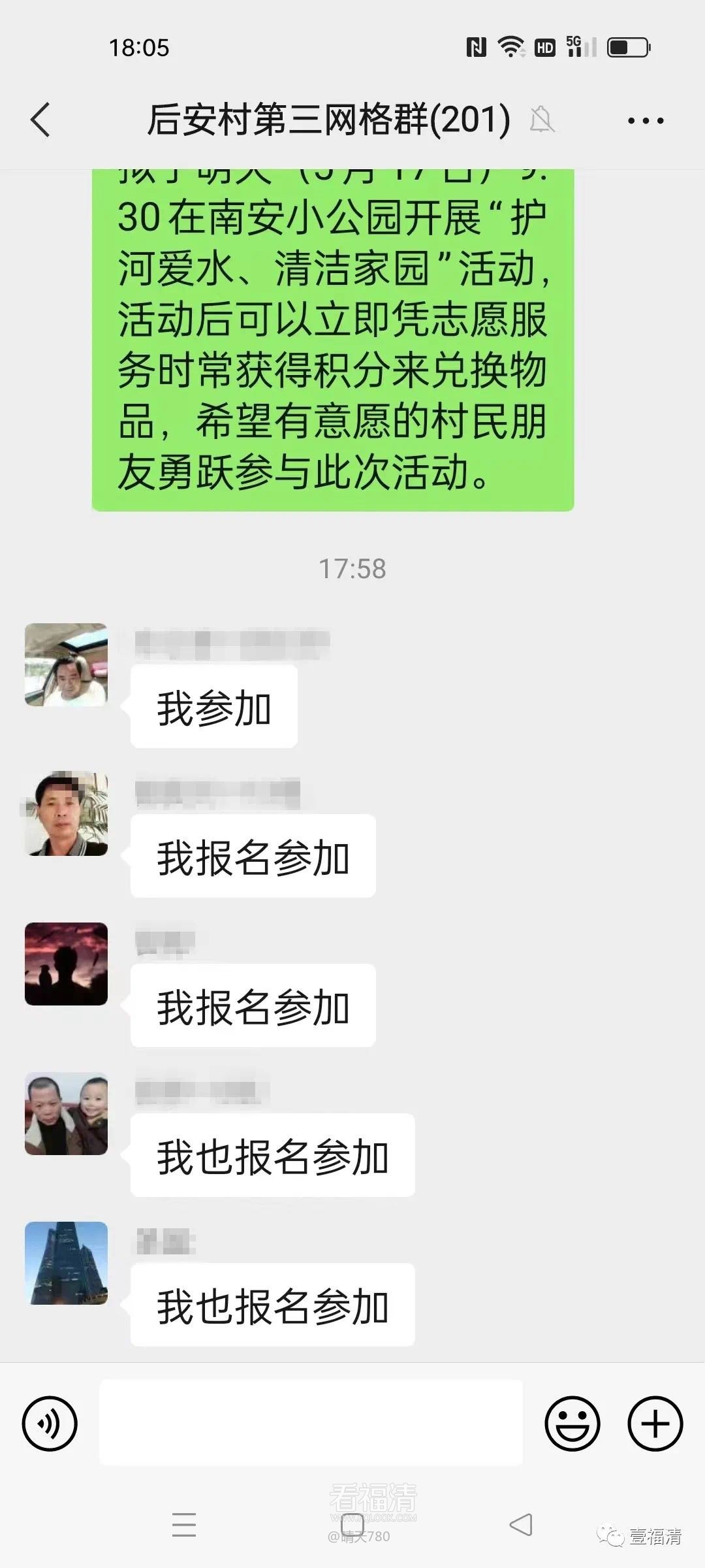 “5月17日,我村在南安小公园开展‘护河爱水、清洁家园’活动,参与者凭志愿服务时长便可获得积分来兑换物品。”陈家城说,16日晚上,他在后安村网格群里发布卫生清洁志愿任务后,立即得到30多位村民的热情响应。