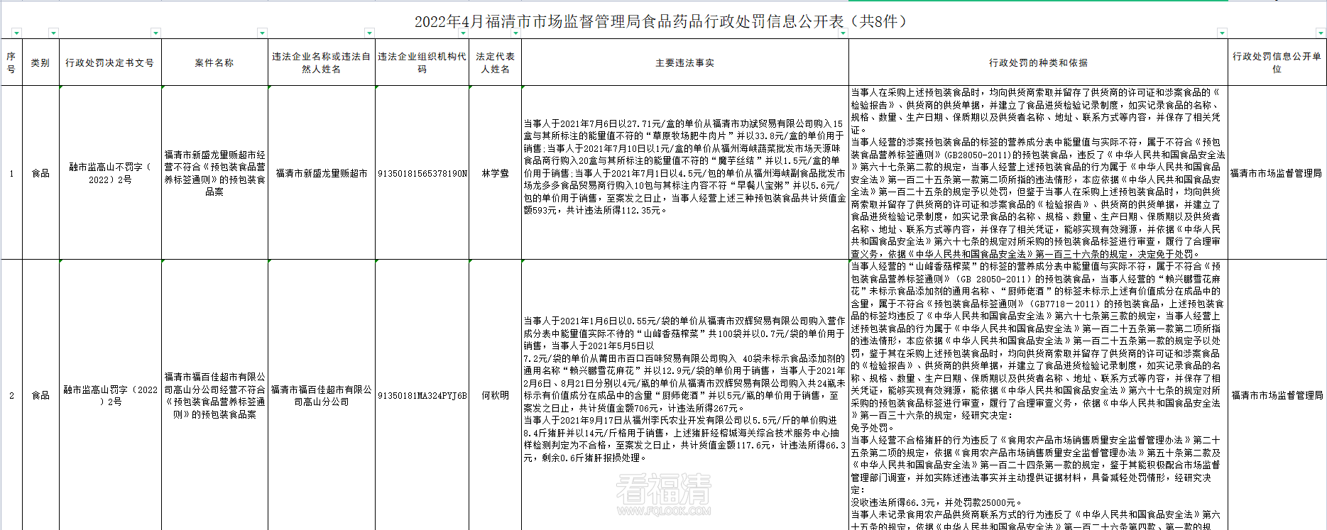 [曝光台] 2022年4月福清市市场监督管理局食品药品行政处罚信息公开 |