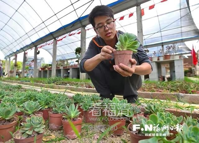 高叶在多肉基地查看植物生长情况。记者 邹家骅 摄