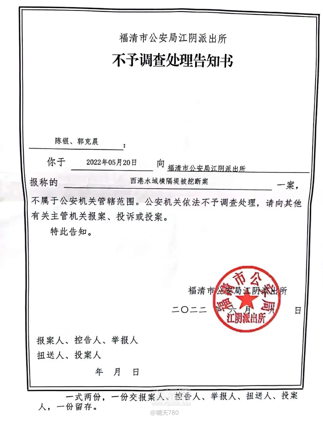 郭克晨说,自己多次报警,但最终都没有获得立案。福清市公安局江阴派出所出具的《不予调查处理告知书》中称,此事不属于公安机关管辖范围,请向其他有关主管机关报案,投诉或投案。