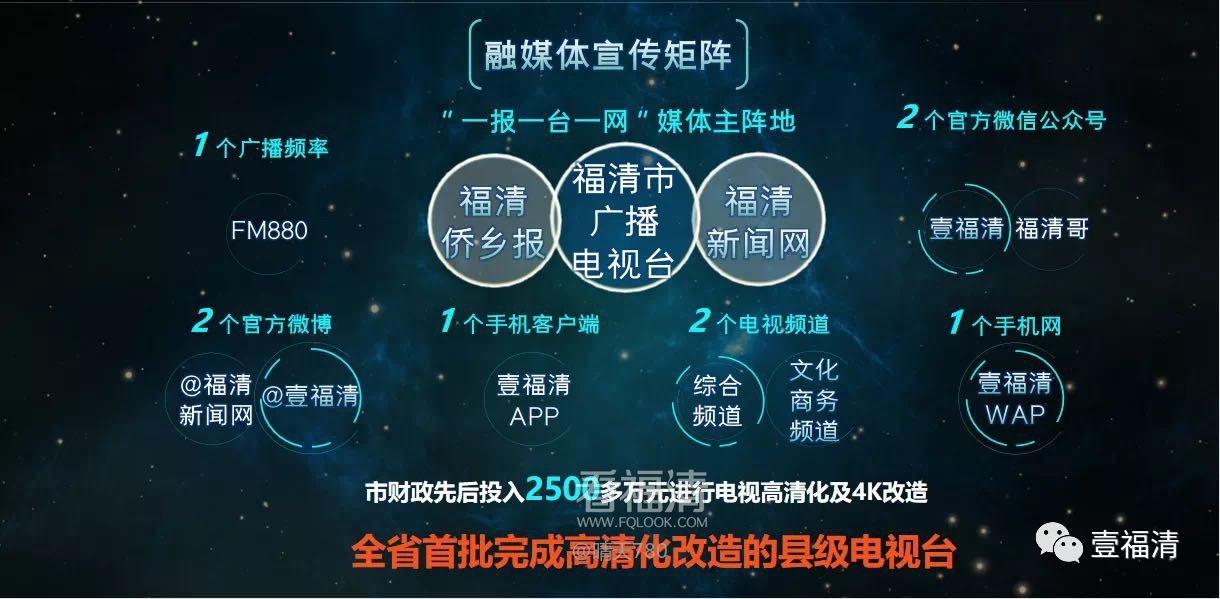 市融媒体中心现有福清侨乡报、福清市广播电视台、福清新闻网及其所属2个电视频道、1个广播频率(FM880)、2个官方微信公众号(壹福清、福清哥)、2个官方微博(@福清新闻网、@壹福清)、1个手机客户端(壹福清APP)、1个手机网(壹福清WAP)。入驻全国和省级主流网络媒体平台,包括央视新闻移动网、人民日报、新华社、今日头条、华人头条、抖音、广电云、海博TV、新福建、“学习强国”等,形成共计25个全媒体平台的融媒体传播矩阵。