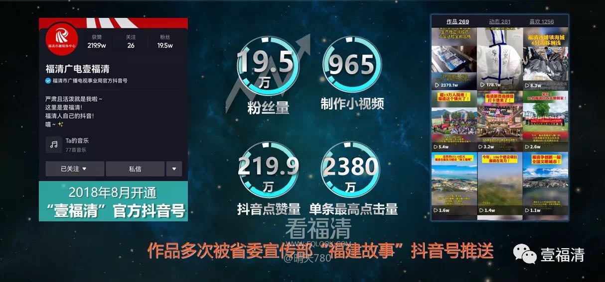 壹福清微信公众号有8篇作品点击量10万+,央媒矩阵30万+共67条,抖音、快手等100万+共4条,其中“壹福清”微信公众号现有粉丝量42.8万,在福建省官方新媒体影响力排行榜中位居前列。