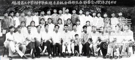 福清第三中学初中毕业班东昇级全体师生合影。后排左3为作者,前排左6为陈华光主任,右3为魏伦诚老师。