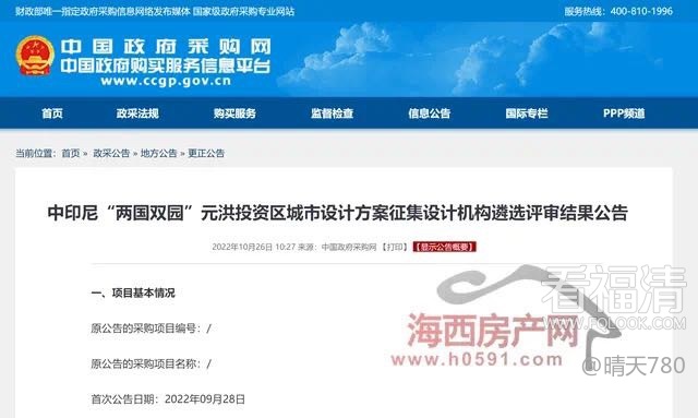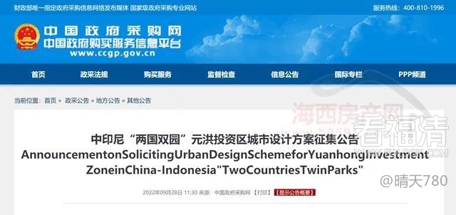 10月26日,中国政府采购网发布“中印尼“两国双园”元洪投资区城市设计方案征集设计机构遴选评审结果公告”。