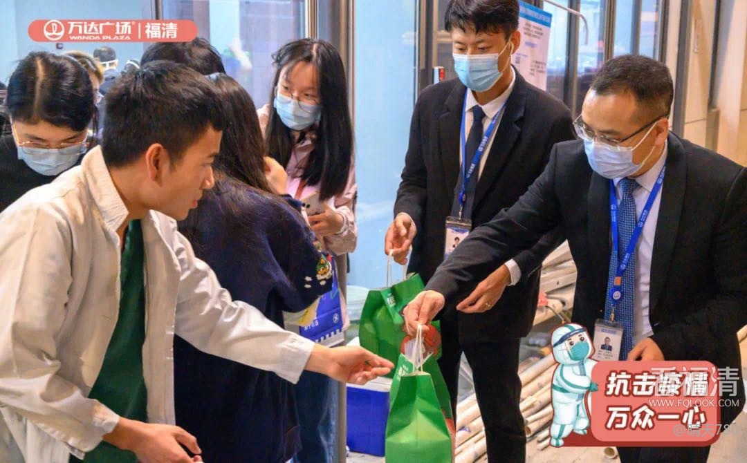 福和万达联合半天妖、星洲蕉叶、胖哥俩、大丰收脆鱼、手心的你等爱心商家,准备爱心午餐,组织送餐队伍,致力于让奋战在疫情防控一线的志愿者和医护人员都能吃饱、吃好。