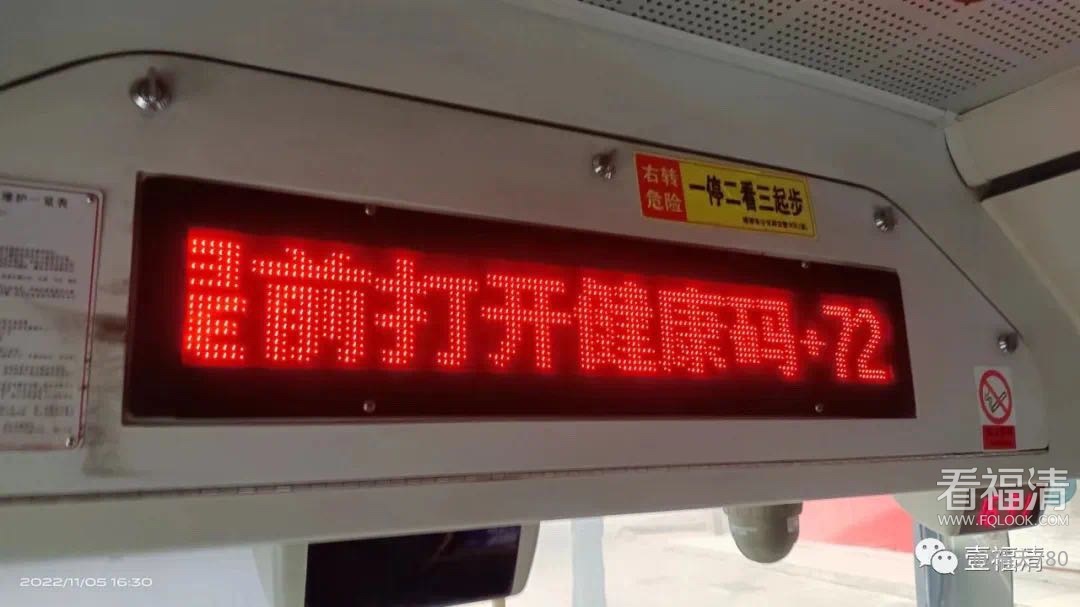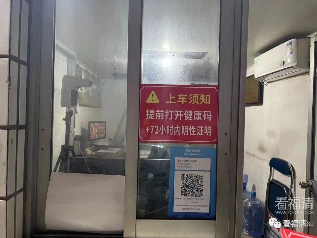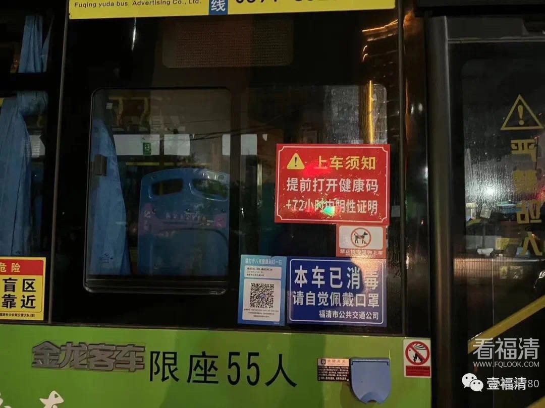 今天,记者在采访中看到,福清汽车站内多处显眼位置张贴有“提前打开健康码+72小时内核酸阴性证明”的提示标语。据了解,公交车首末站、各公交站亭、公交车身均有粘贴此标语。